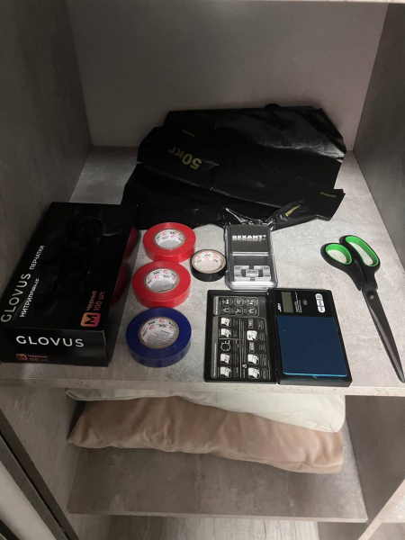 В ходе личного досмотра и осмотра места происшествия оперативники обнаружили и изъяли 227 обёрнутых изолентой пакетиков с метадоном. Дополнительно в арендованных квартирах, которые использовали члены группы, были найдены ещё 359 аналогичных свёртков, а также приспособления и материалы для фасовки и упаковки наркотических средств.